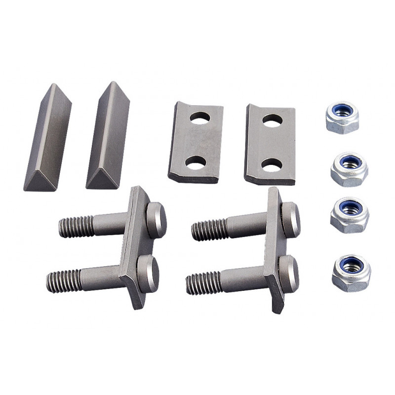 - Náhradné diely obsahujú: 2 x rezné hrany, 4 x držiaky nožov, 4 x skrutky, 4 x matice