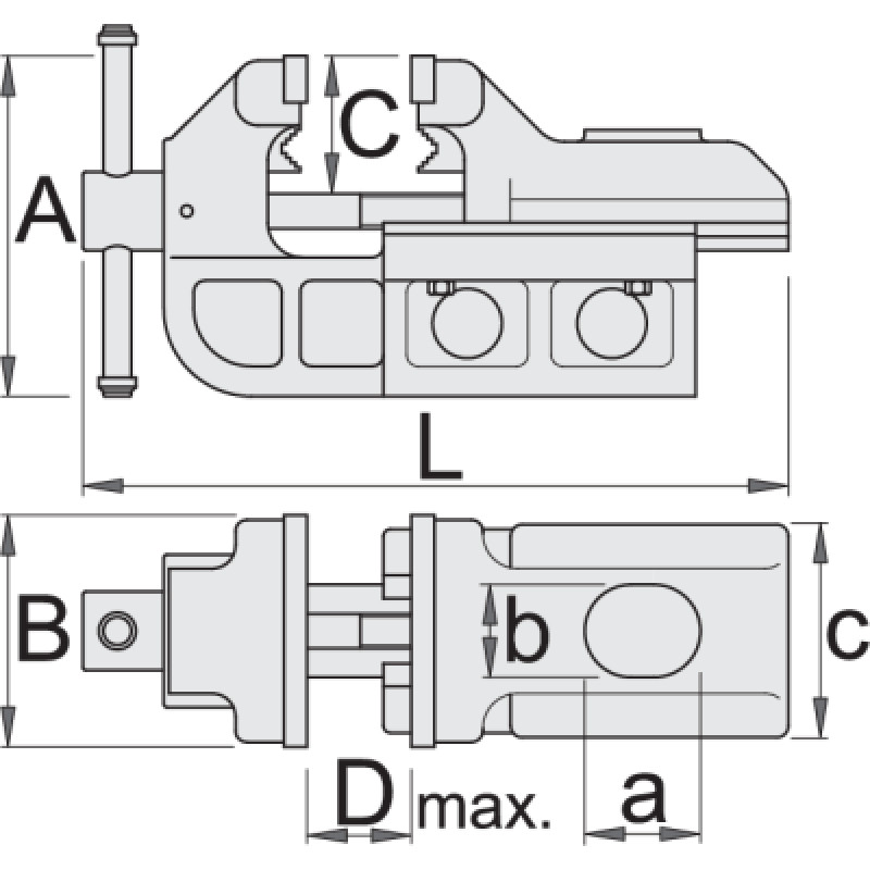 | Katalógové číslo | B | D max. | L | Max. priemer trubky | C | a | b | c | A | Váha | Priem. Balenie | Cena s DPH |