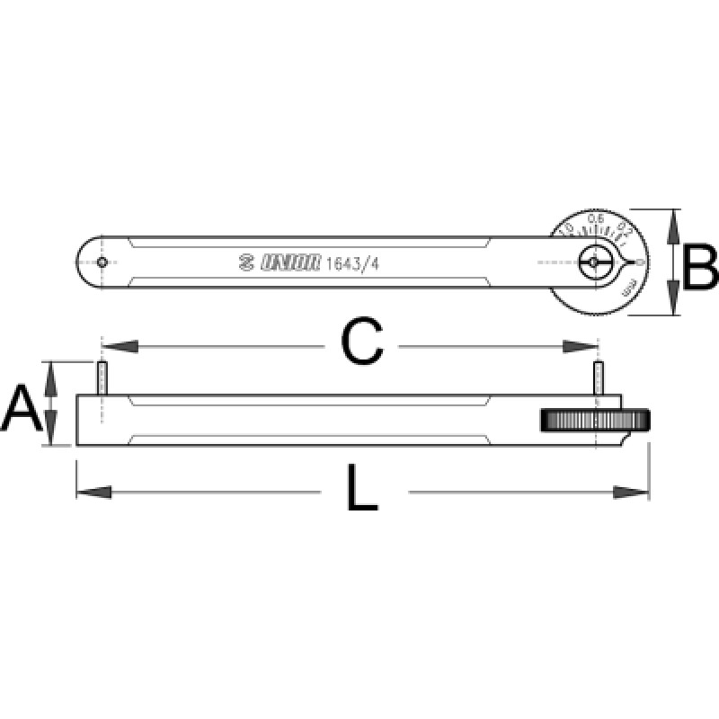 - Umožňuje rýchlo a presne zistiť opotrebovanie a natiahnutie reťaze. Jednoducho vložte kolíky mierky medzi dva články reťaze, stlačte výkyvné rameno mierky a skontrolujte okienko na presné odčítanie.