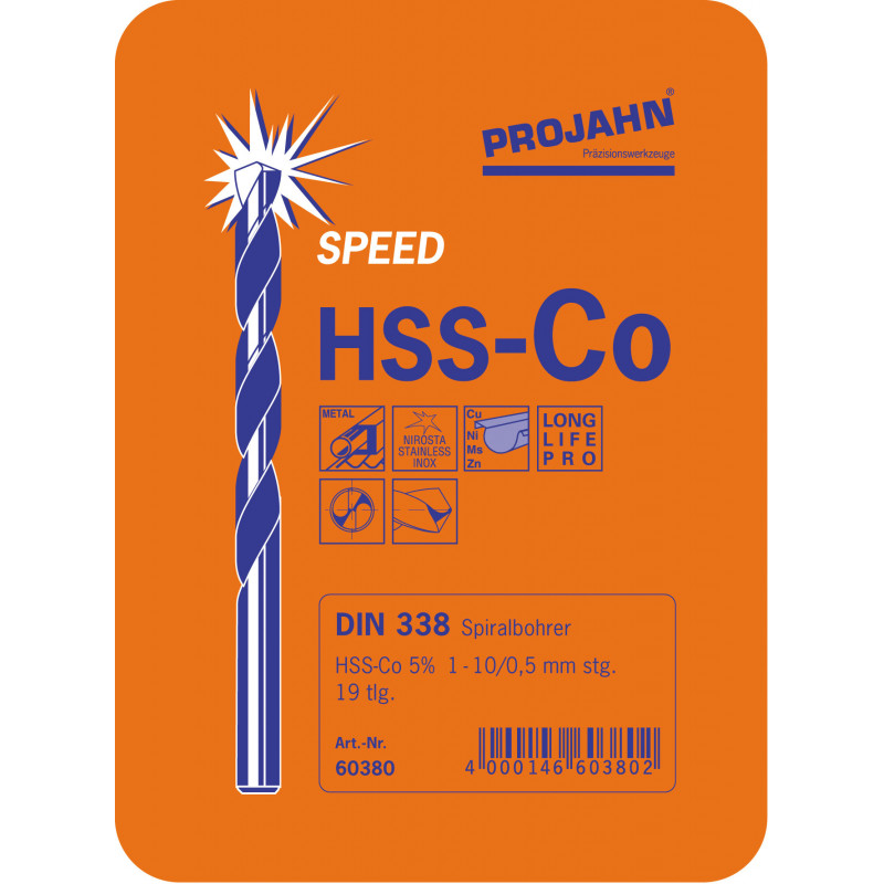 - Obsah balenia: 19 krátkych viacúčelových špirálových vrtákov HSS-Co DIN 338 typ S, Ø 1 - 10 mm zvýšenie o 0,5 mm