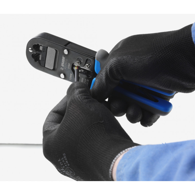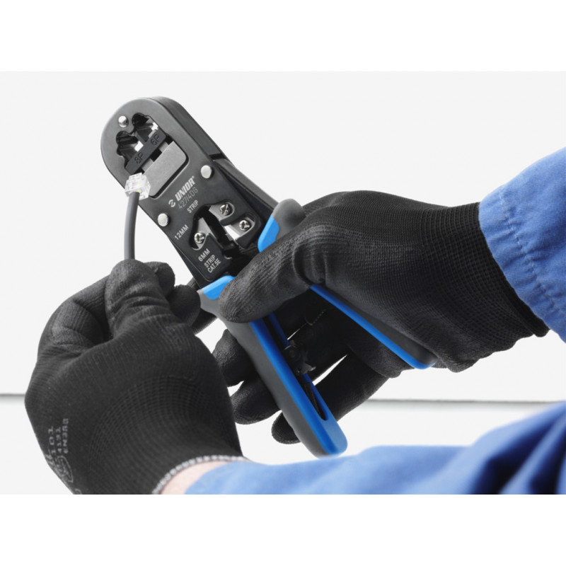 - Pre lisovanie 4-, 6-, a 8- pólových zásuviek typ RJ 11/12 (9,658 mm široké) a typ RJ 45 (11,68mm široké).
