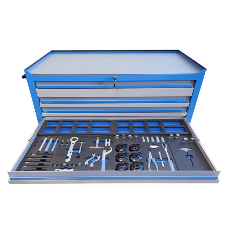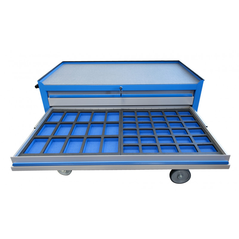 - Zväčšená hĺbka hornej zásuvky umožňuje uložiť všetky hlavice, vrátane dlhých, vo zvislej polohe. To poskytuje maximálnu efektivitu priestoru a zvyšuje počet náradia, ktoré je možné uložiť do zásuvky, v porovnaní s tradičnými plytkými zásuvkami. Vo zvislej polohe môže byť všetko väčšie náradie uložené do maximálnej výšky 110 mm
