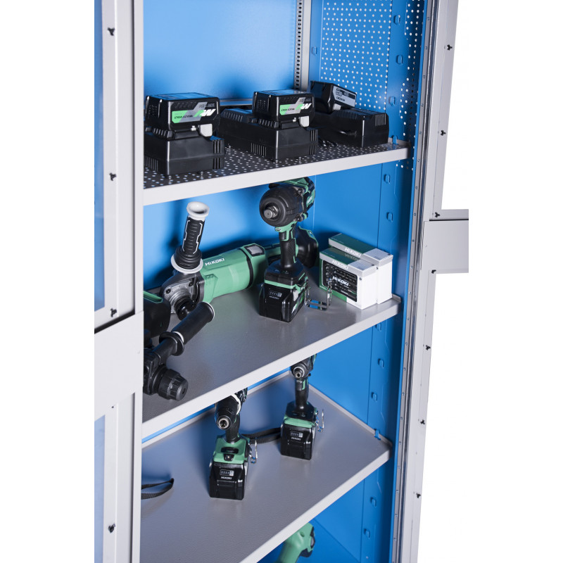 - Nabíjacia stanica má priame pripojenie k elektrickej sieti. So štyrmi policami vám umožňuje nabíjať akumulátorové náradie alebo pripojiť ďalšie elektrické príslušenstvo, ako je telefón, notebook a ďalšie inteligentné zariadenia. Je nepostrádateľným prvkom modernej dielne.