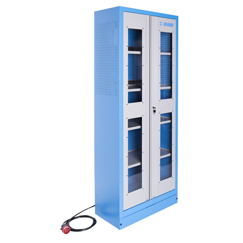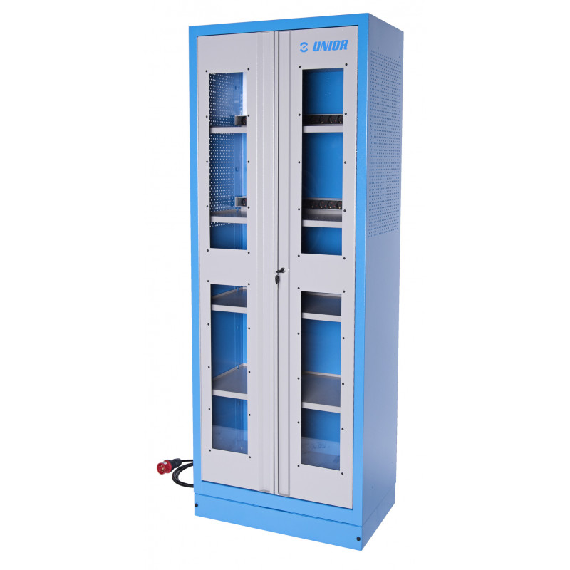 - Horné dve police sú určené na plnenie batérií, každá obsahuje rozdeľovač s 12 zásuvkami (230V) s nadprúdovou ochranou a resetovacie tlačidlo. Zelené svetlo ukazuje správnu činnosť rozdeľovača.