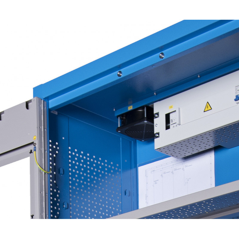 - Kryt tiež obsahuje ventilátor umožňujúci prúdenie vzduchu pri 160 m3 / h, ktorý sa aktivuje pri nastavenej teplote a odvádza horúci vzduch zo skrinky, vpredu obsahuje sieťovinu a filter a kryt nad ventilátorom obsahuje perforáciu na odstránenie vzduchu