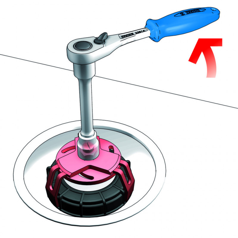 - Nástroj má 3 odnímateľné háky, ktoré uchopia veko palivovej nádrže. Nasaďte kľúč na veko a otáčajte správnym smerom. Kľúč sa sám prispôsobí veľkosti viečka.