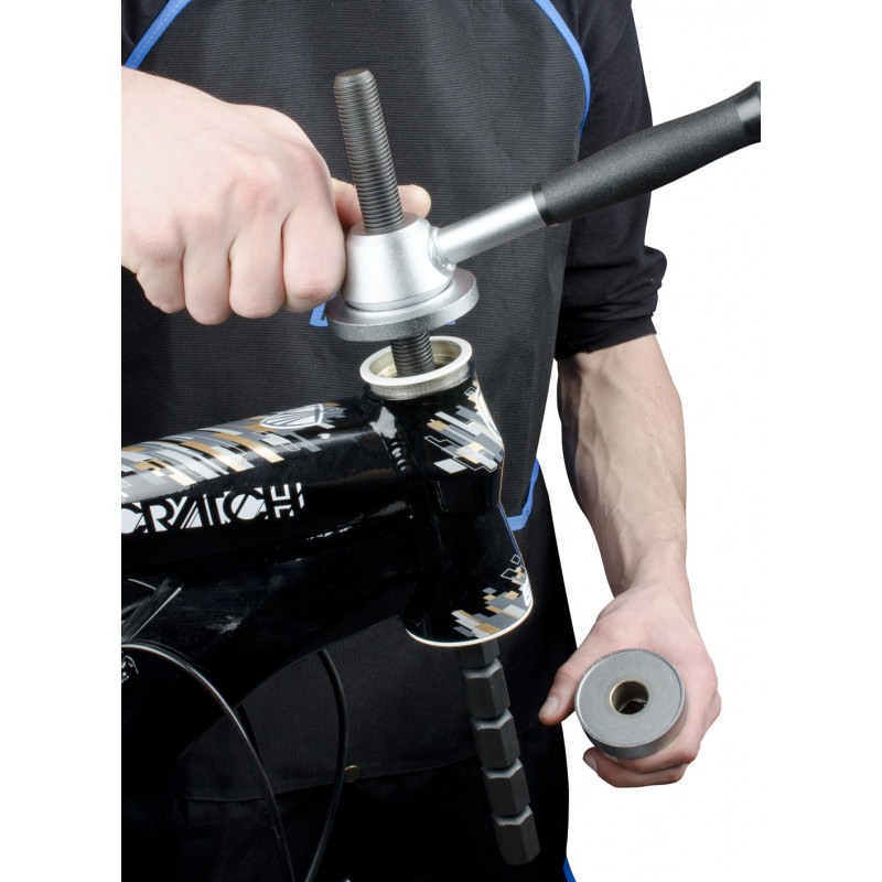 - Toto náradie presne zarovná a nalisuje šálky 1" 1 1/8" , 1 1/4" a 1 1/2" do hlavy riadenia. Je možné doplniť dlhší hriadeľ pre hlavy BMX s dlhšou trubicou.