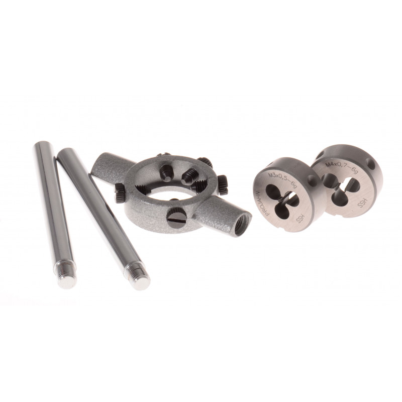 - Obsah balenia: 7 matríc HSS-G DIN 13 - M3 · M4 · M5 · M6 · M8 · M10 · M12 / 1 držiak matrice 25 x 9 mm